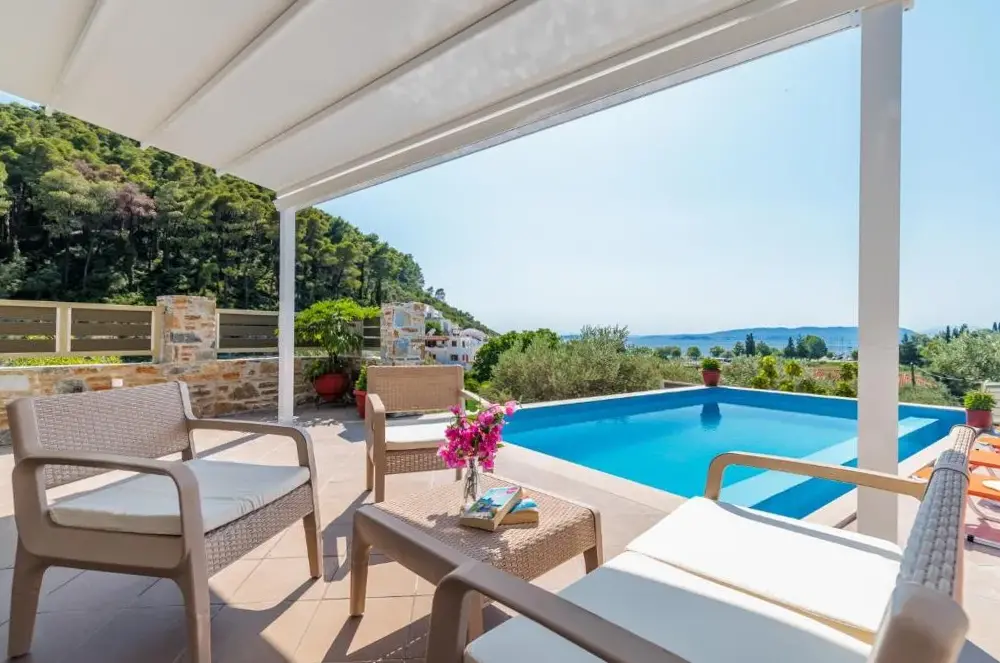 More information about Koromilia VillaVilla Ameli is a recently renovated vacation home located in Neo Klima on Skopelos Island, Greece. This spacious property features a free outdoor swimming pool, complimentary WiFi, and convenient free parking. Guests enjoy proximity to several attractions including Hovolo Beach just 400 meters away, Elios Beach at 300 meters, and Milia Beach within 2 kilometers.